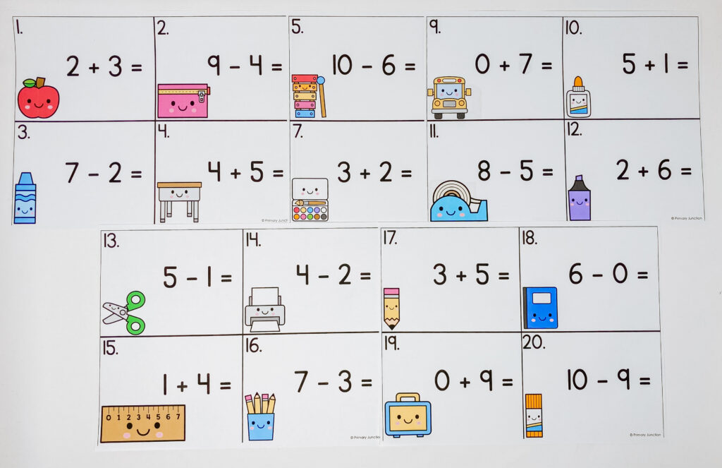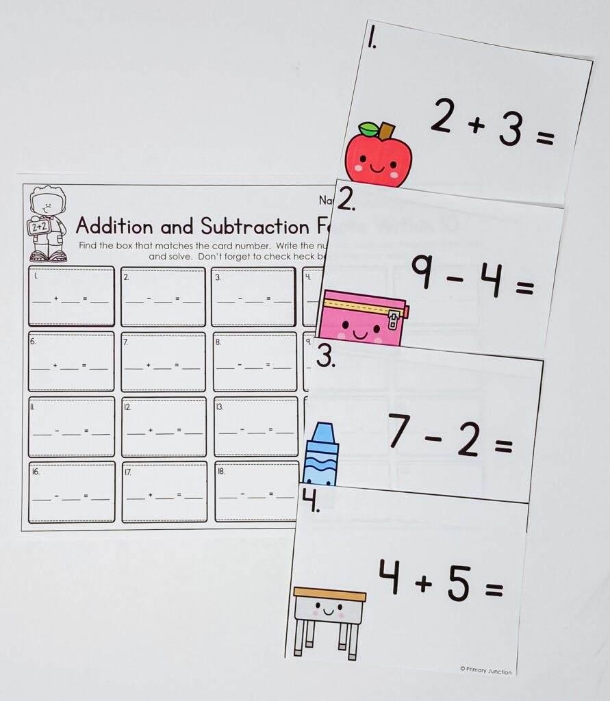 Each card has a simple number sentence — addition or subtraction — with sums and differences within 10. Think: