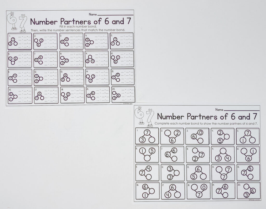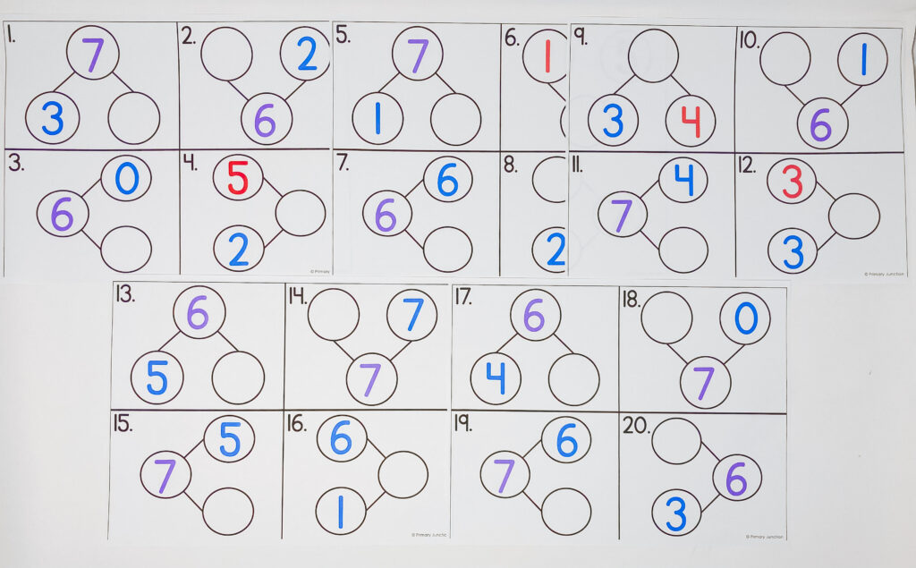 While Scoot isn’t always the best way to differentiate, this particular set includes two versions of recording sheets so you can easily support all learners. Some students can stick to completing number bonds only, while others can extend their thinking by writing out the full fact families for each number bond.