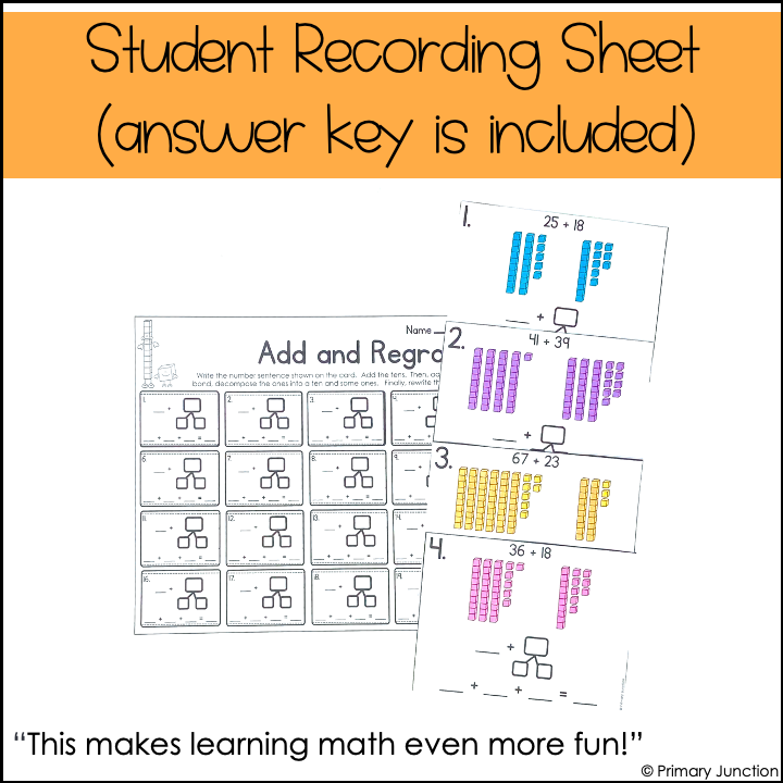 Add and regroup strategies come to life with this Scoot Game or Write the Room activity. Students practice two-digit addition with regrouping using visuals and base ten blocks.