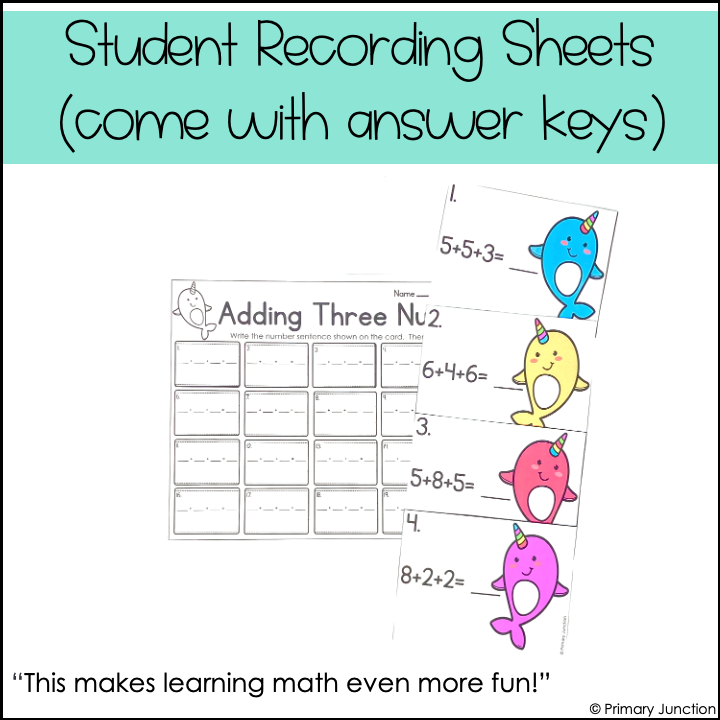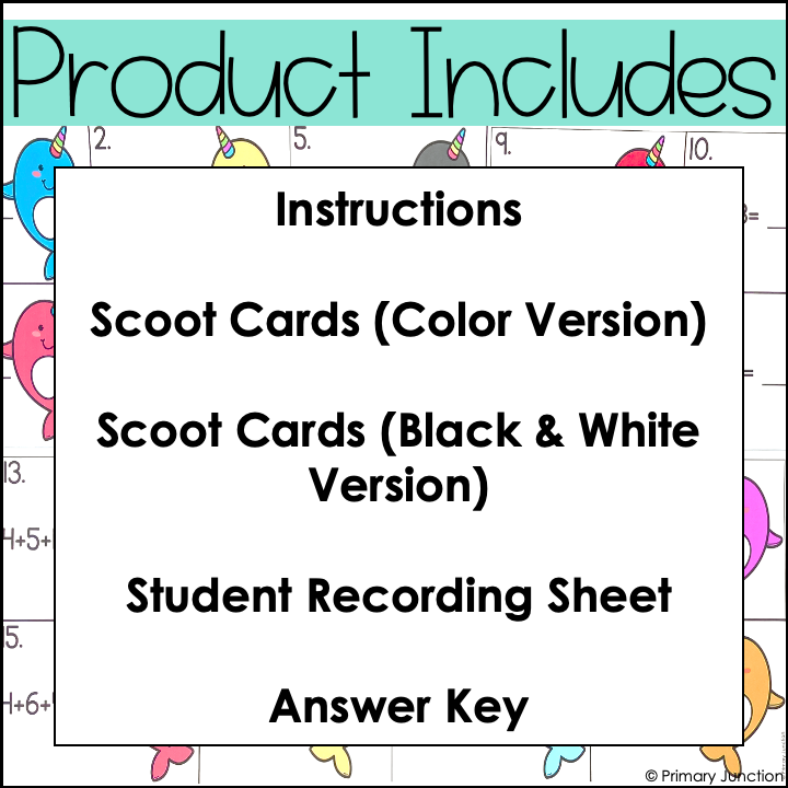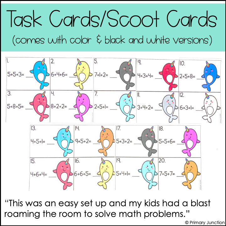 Whether playing a scoot game, completing independent task cards, or participating in a math write the room activity, students will gain ample practice with adding 3 numbers. Many of the number sentences included in this adding 3 numbers scoot game involve doubles facts and number partners of 10, so students can gain practice looking for doubles facts or a way to make 10 to help them solve the number sentences with three addends. On the included adding 3 numbers recording sheet, students will copy the number sentence shown on the card and solve the equation. Both color and black-and-white versions of the task cards are included.
