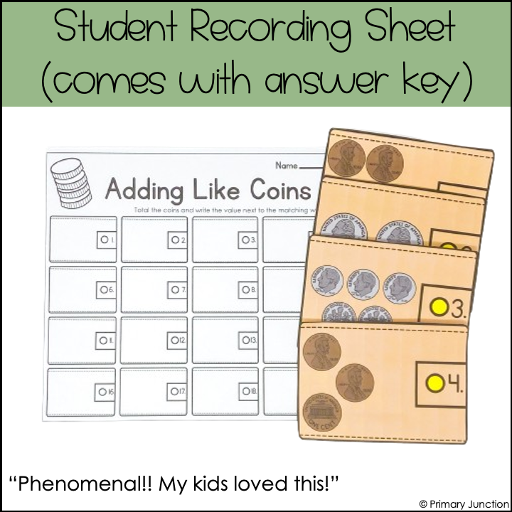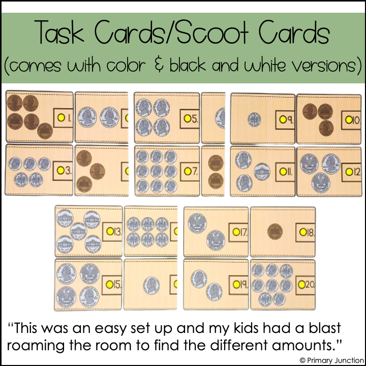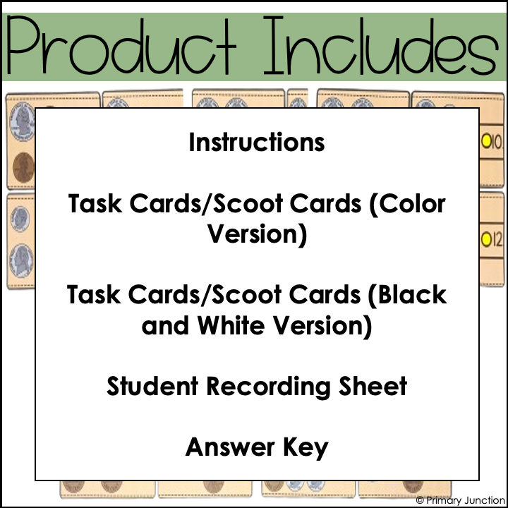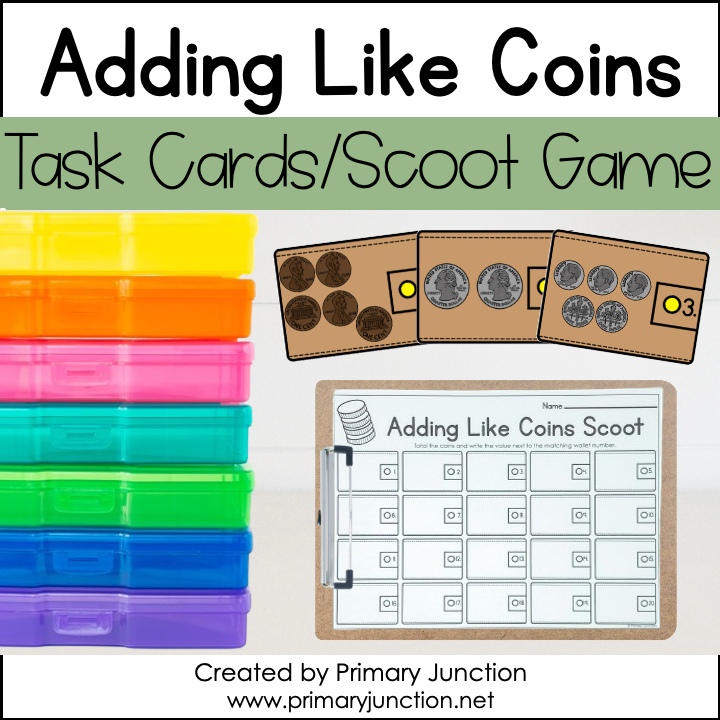 Whether playing a scoot game, completing independent task cards, or participating in a math write the room activity, students will gain ample practice identifying coins, counting coins, and adding like coins! Students will practice adding groups of pennies, nickels, dimes, and quarters to equal a total value of one dollar or less. Both color and black-and-white versions of the task cards are included. Use the black and white version to save ink or for a challenge – students can practice identifying, counting, and adding coins without seeing the color of the coins!