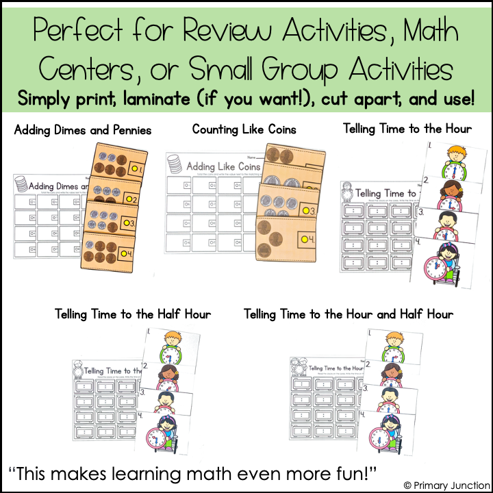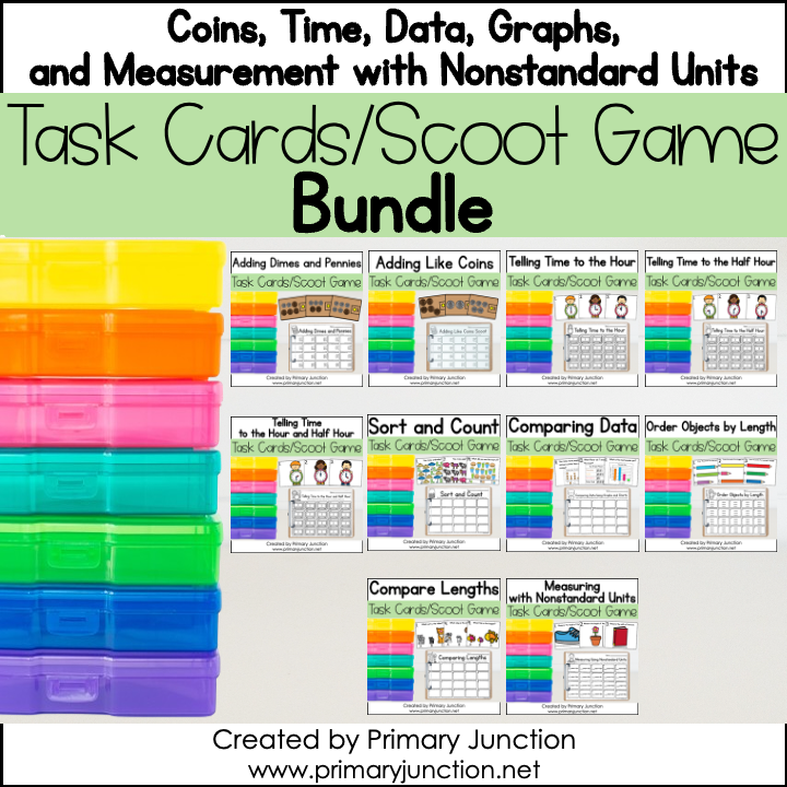 Bring movement, excitement, and deeper understanding to your math block with this bundle of Coins, Time, Data, Graphs, and Measuring with Nonstandard Units Scoot Games, Task Cards, and Math Write the Room Centers!