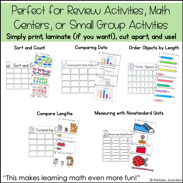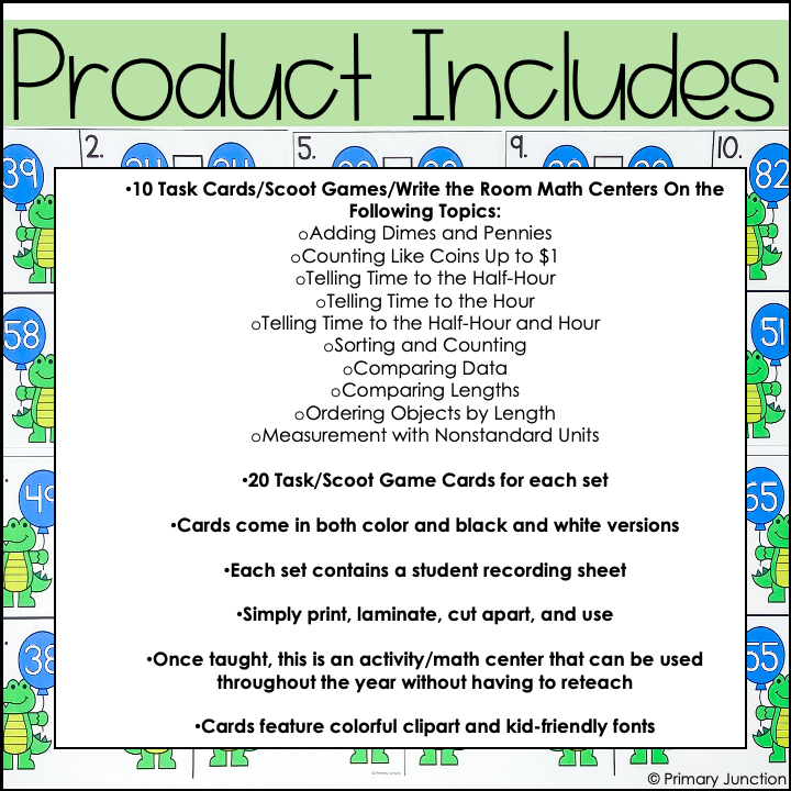 Are your students learning about coins, time, data, graphs, and measuring with nonstandard units? Do you need engaging and interactive activities to help them practice these important First Grade math skills? This Coins, Time, Data, Graphs, and Measuring with Nonstandard Units Scoot Games bundle of 10 Scoot Games/Task Card Sets/Math Write the Room Centers is the perfect way to review key concepts while keeping students active, engaged, and having fun!
