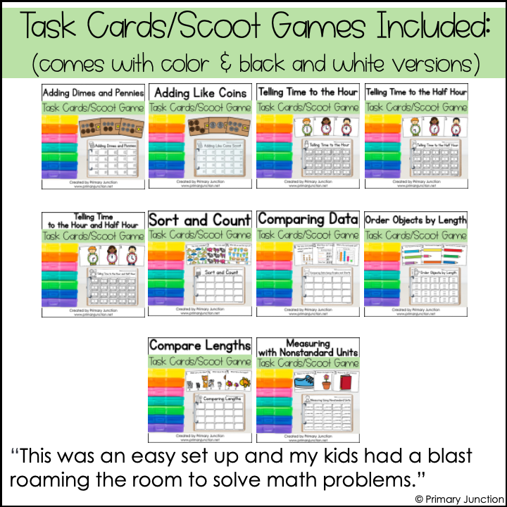 This set of 10 Coins, Time, Data, Graphs, and Measuring with Nonstandard Units Scoot Games/Task Cards/Write the Room Math Centers covers a wide range of essential math skills: