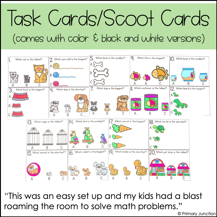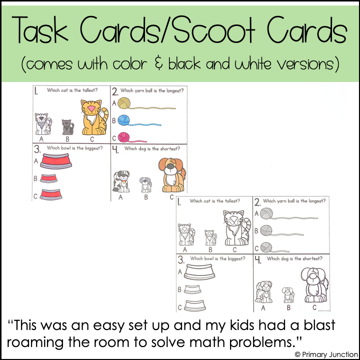Are your students learning how to Compare Lengths or Measurements? This Comparing Lengths Scoot Game, Task Card activity, or Math Write the Room Center is the perfect interactive resource to help students build measurement skills. With these task cards, students will practice identifying the shortest object, tallest object, longest object, biggest object, and smallest object while staying engaged and active. Use this Scoot Game as a whole-class activity, in small groups, or as a Math Write the Room Center for independent practice.