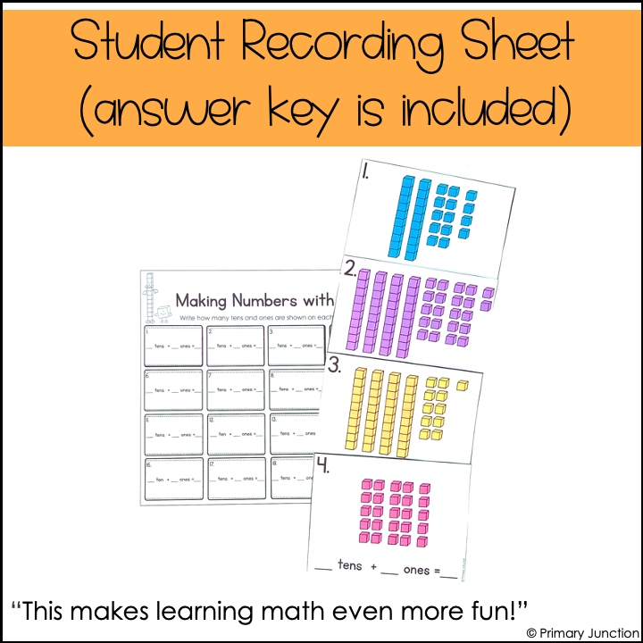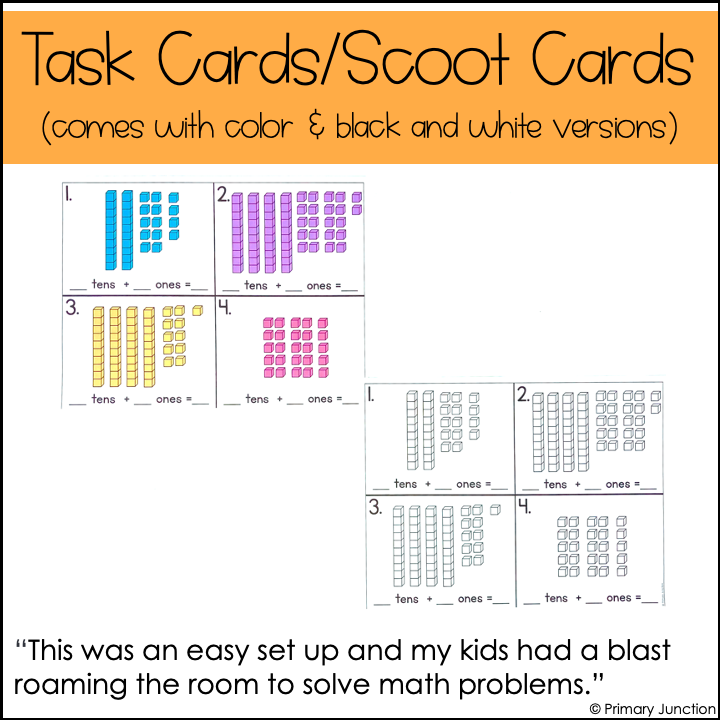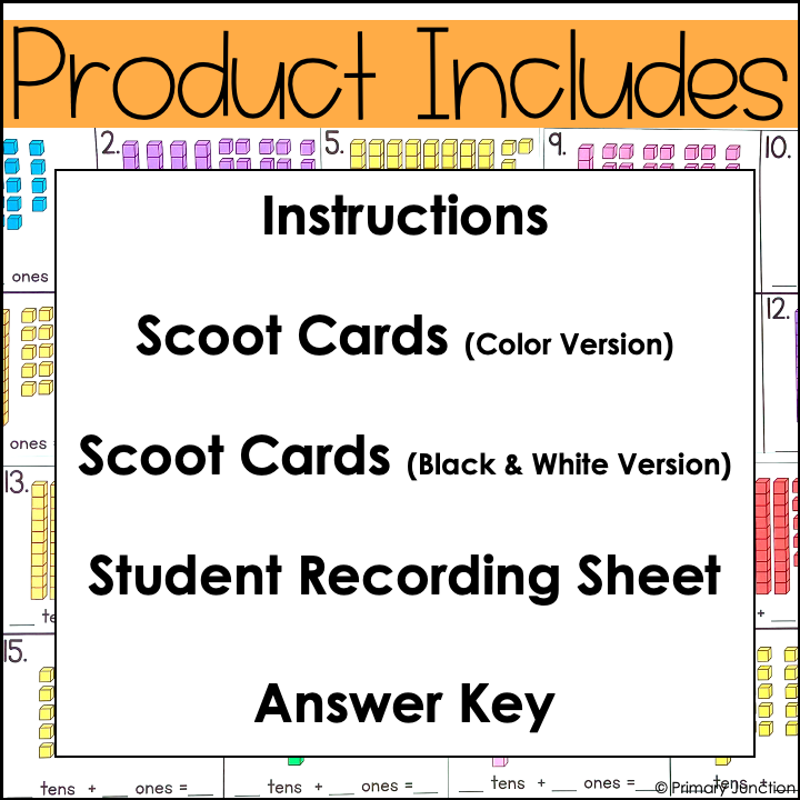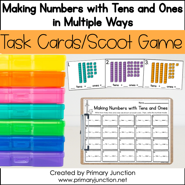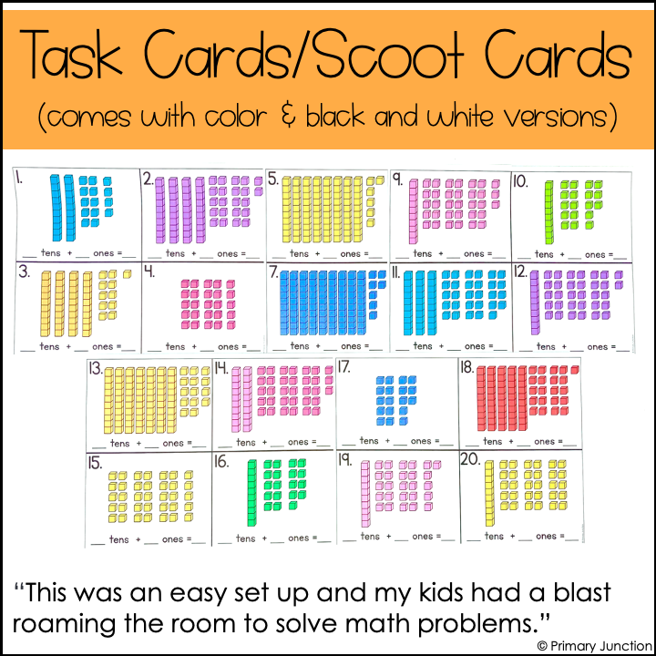 Twenty task cards/scoot game cards are included in this Identifying Numbers Using Tens and Ones in Multiple Ways resource, as well as a student recording sheet with an answer key. Both color and black-and-white versions of the task cards are included. Use the black and white version to save ink.