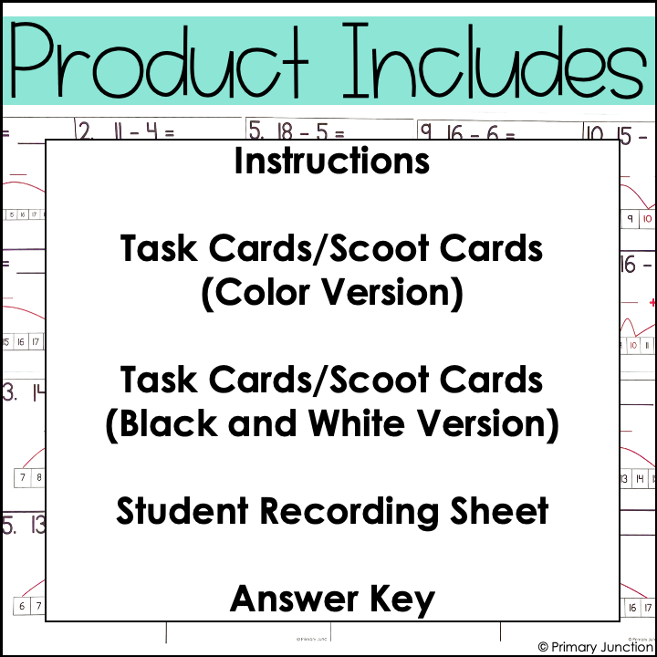 Included in this pack are 20 task cards/scoot game cards. With these make a 10 to subtract task cards, students will practice solving subtraction within 20 problems using the make a 10 to subtract strategy. Both color and black-and-white versions of the task cards are included. Use the black and white version to save ink.