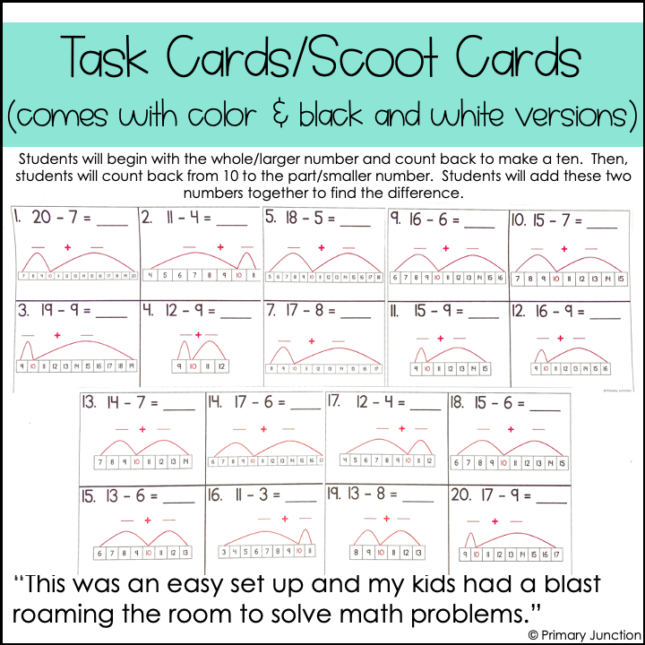 Whether playing a scoot game, completing independent task cards, or participating in a write the room activity, students will gain meaningful practice using the make a 10 to subtract strategy. In each problem, students start at the larger number (the whole), count back to 10, and then count back from 10 to the smaller number. They then add the two parts together to solve the subtraction within 20 equation.
