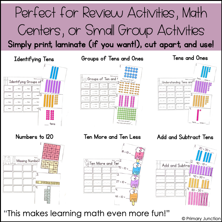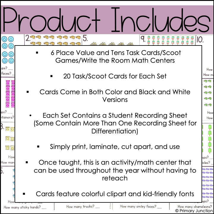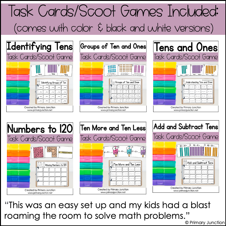 Are your students learning about place value and understanding tens and ones? Are you looking for fun and engaging ways for your students to practice place value, tens and ones, numbers to 120, ten more and ten less, and adding and subtracting tens? If so, this bundle of 6 Scoot Games/Task Card Sets/Write the Room Math Centers is perfect for reinforcing key First Grade math skills through movement, number sense, and engagement!