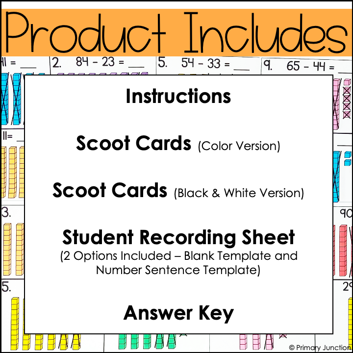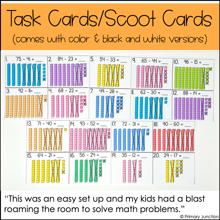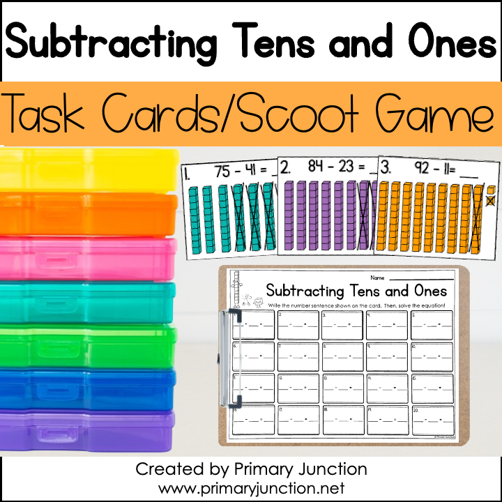 Subtracting tens and ones is fun with this Scoot Game or task cards. Students practice two-digit subtraction without regrouping using hands-on base ten blocks.