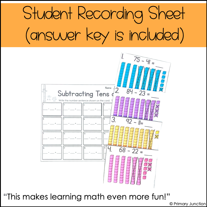 Each task card uses base ten blocks to visually represent the subtraction problem and support student thinking. On their recording sheet, students will write the subtraction sentence shown on the card and record their answer.