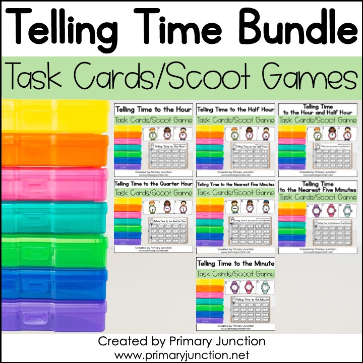 This set of 7 Telling Time Scoot Game Bundle/Task Cards/Write the Room Math Centers covers the math skills of: telling time to the hour, telling time to the half-hour, telling time to the quarter-hour, telling time to the nearest five minutes, and telling time to the minute.
