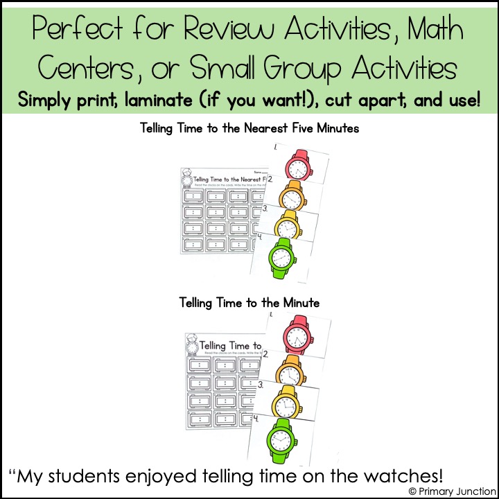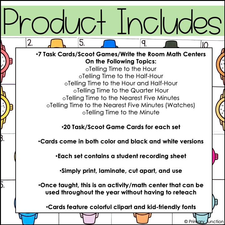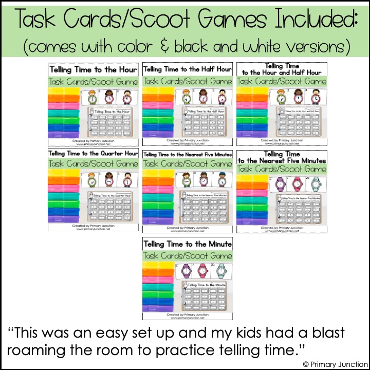 Each Telling Time Scoot Game Bundle/Task Card/Write the Room Math Center resource includes 20 Scoot Game/Task Cards that can also be used in math centers, as task cards, or as a write the room math activity. Whether you’re teaching a whole-class lesson, independent math centers, or reviewing in small groups, these Telling Time activities will keep your students engaged and learning!