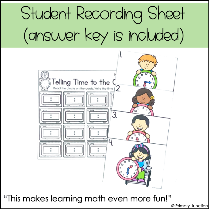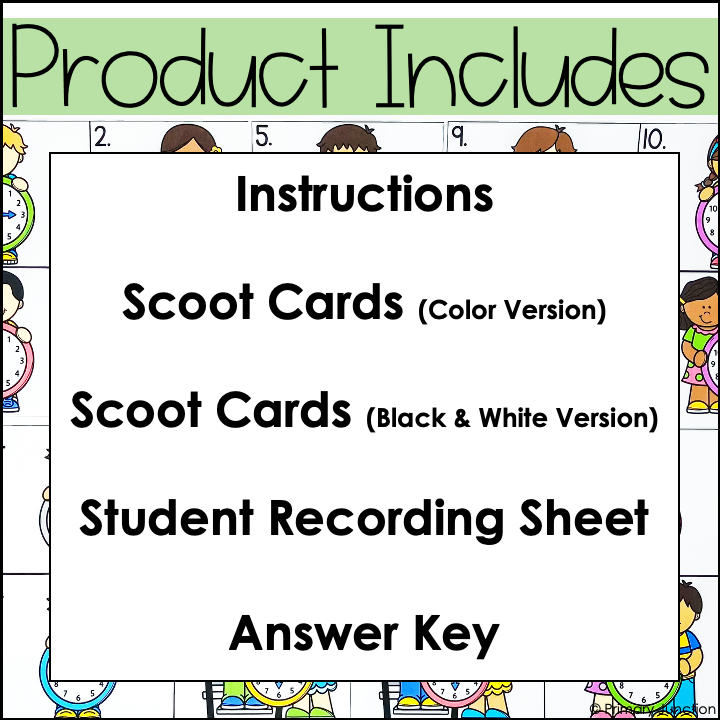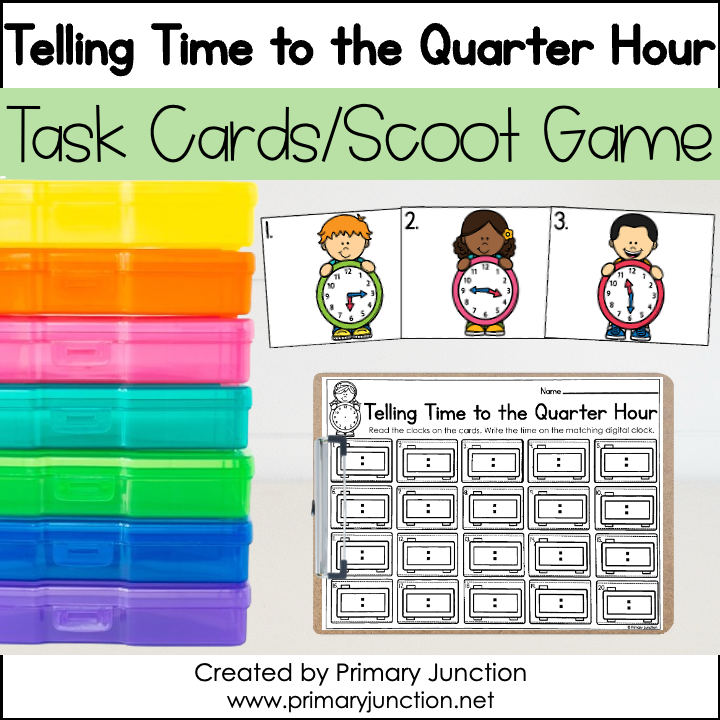 This Telling Time to the Quarter Hour Scoot Game or Write the Room activity helps students practice reading analog clocks and writing the matching digital time.