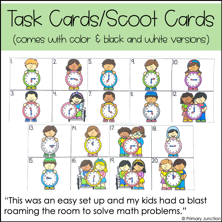 This Telling Time to the Quarter Hour Scoot Game can be used in multiple ways: play as a whole-class Scoot Game, set it up as a Math Write the Room Center, or use it in small groups for extra practice. Whether you’re reviewing time to the quarter hour or introducing it, these task cards make practice fun, active, and effective.