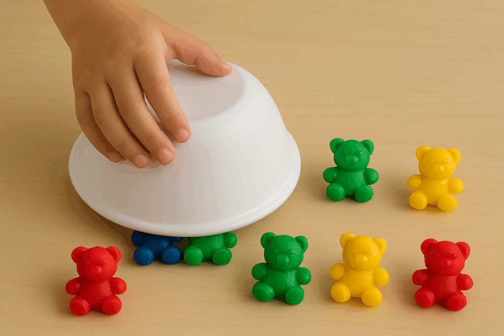 - Hide some of the bears under a bowl. That’s the “cave!”