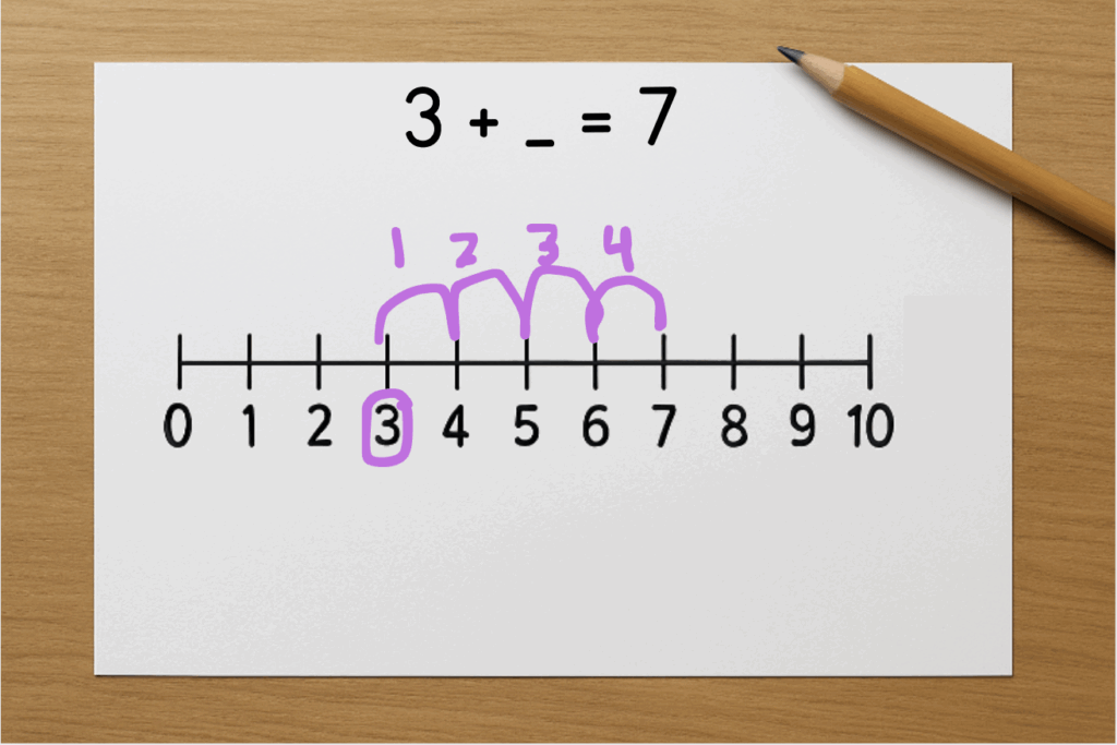 “Okay, I already have 3. Now let’s count up until I get to 7. Four… five… six… seven. How many numbers did I say? FOUR! So the missing addend is 4!”