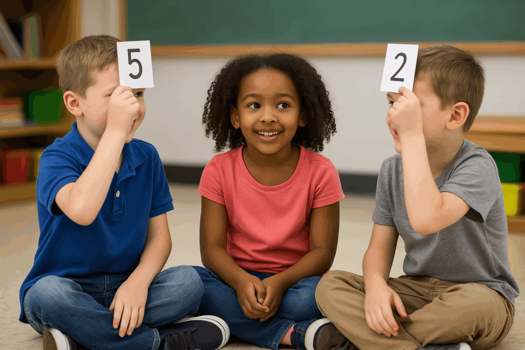 Two players will draw one card each and hold the index card to their foreheads while a third student calls out the total. The players must use the visible card and count up to discover their own number (the missing addend). Students will be completely engaged and love this game!